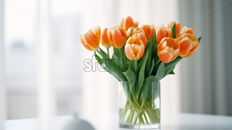 Orange and white tulips in a glass vase