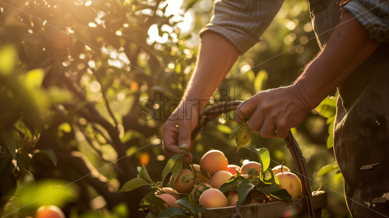 A diligent farmworker in the lush orchards of California’s Central Valley, harvesting fruits beneath the midday sun.