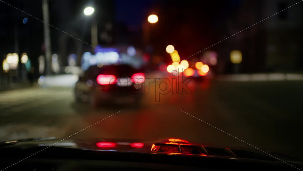 Out of focus night traffic seen through a car windshield, colorful city lights forming soft bokeh