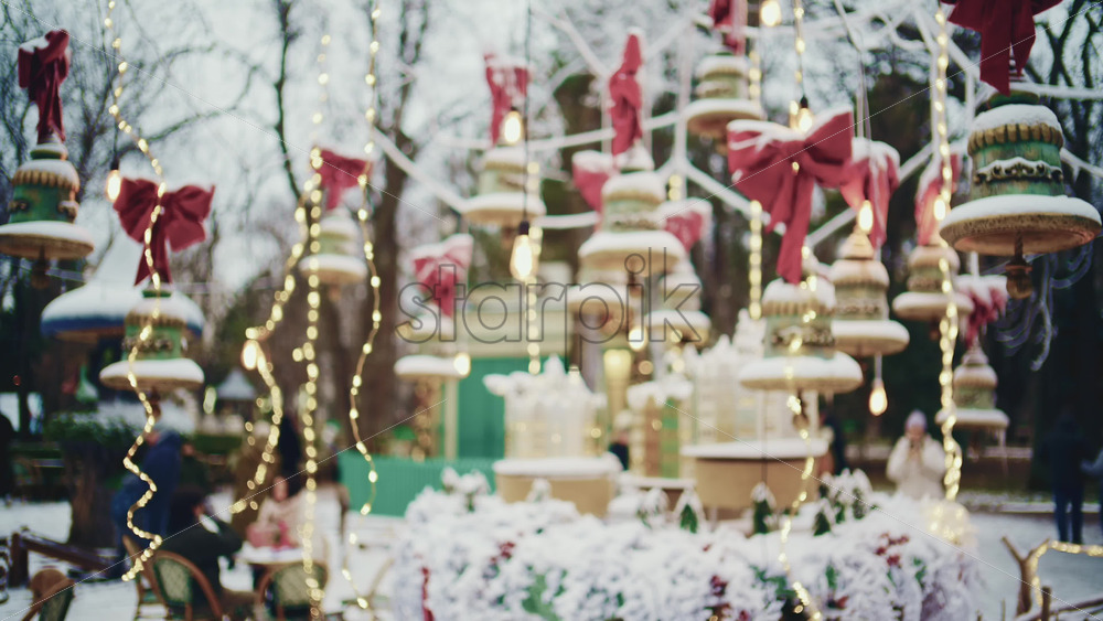 Outdoor cafe decorated with hanging ornaments, lights, and bows during winter