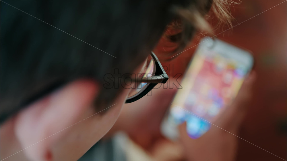 Over-the-shoulder close-up of a kid with glasses playing on a smartphone indoors Royalty Free Stock Video Footage