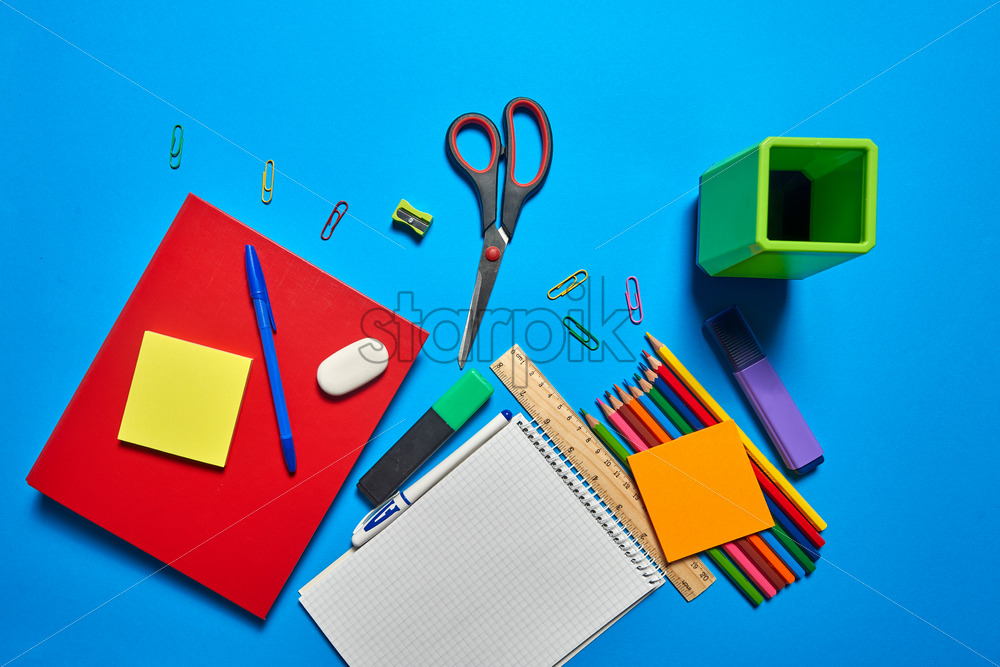 Overhead shot of school and office supplies on vibrant blue background Royalty Free Stock photo