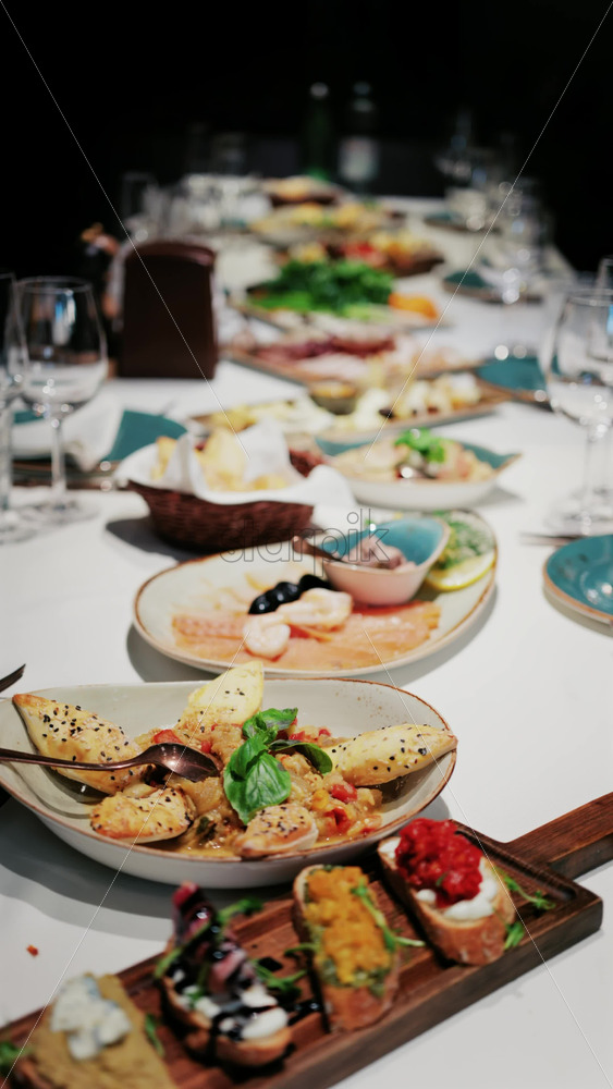 Overhead view of a restaurant table filled with gourmet appetizers, bread, seafood, and salads. Vertical Royalty Free Stock Video Footage