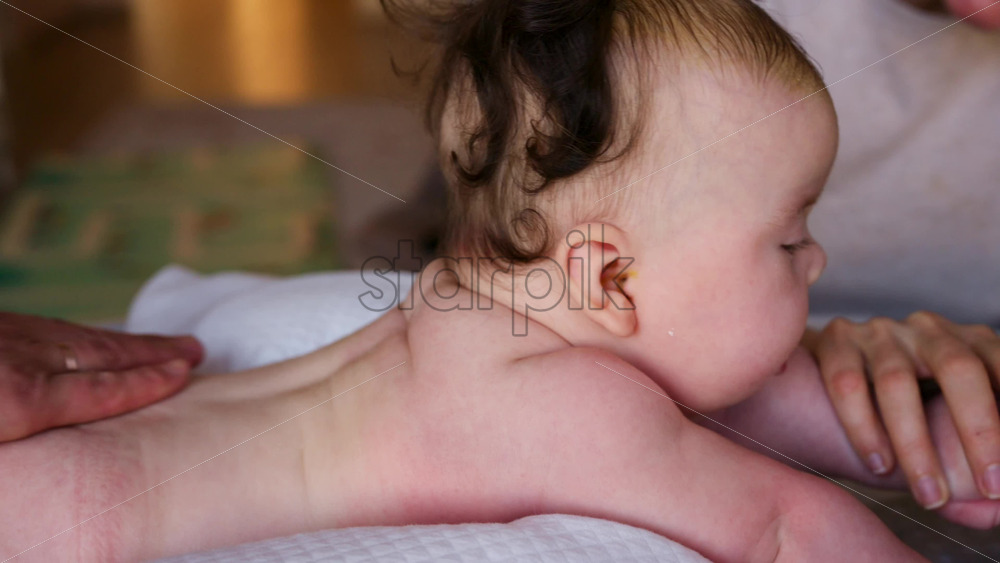 Close up of a baby lying on tummy while a caregiver gently massages the infant’s head