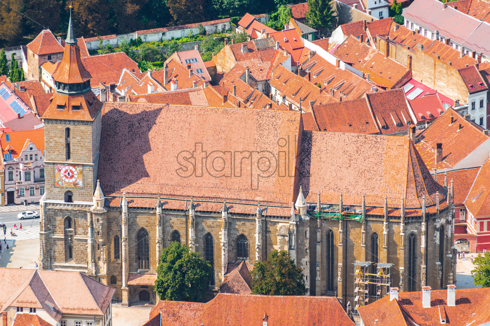 Overhead view of Black Church near beautiful old buildings in daylight in Brasov. Famous sights of the city Royalty Free Stock photo