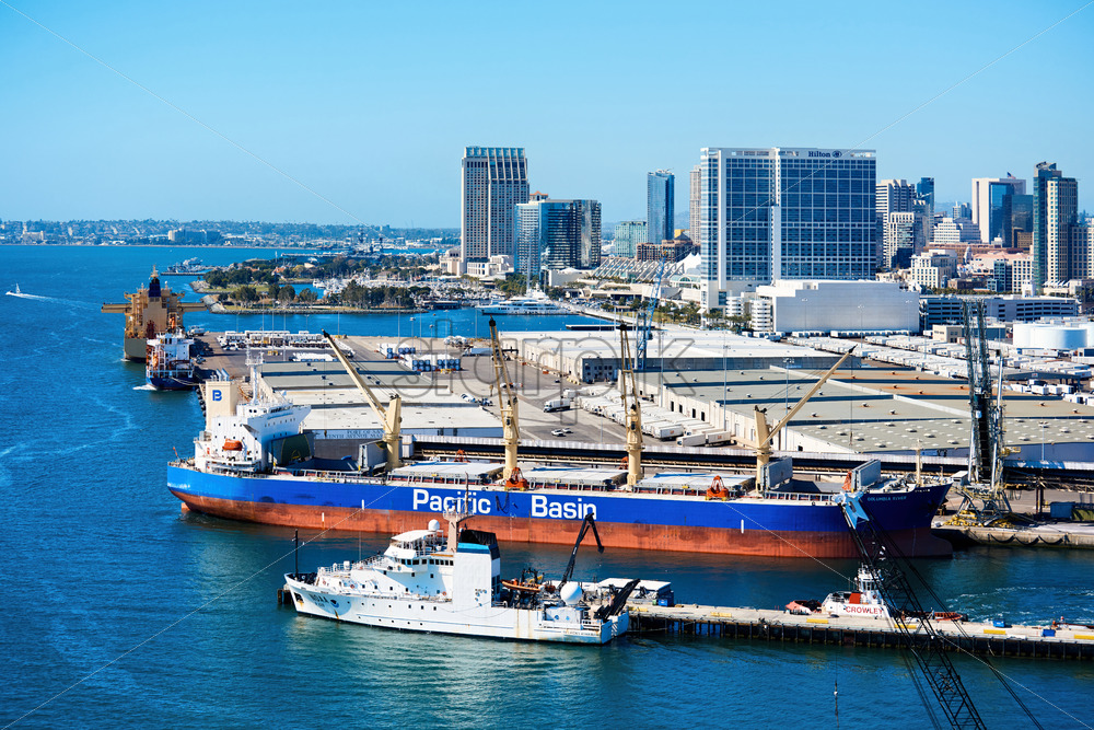 SAN DIEGO, CALIFORNIA – SEPTEMBER 30, 2019: Pacific Basin boat parked in city downtown dock. Skyline on background
