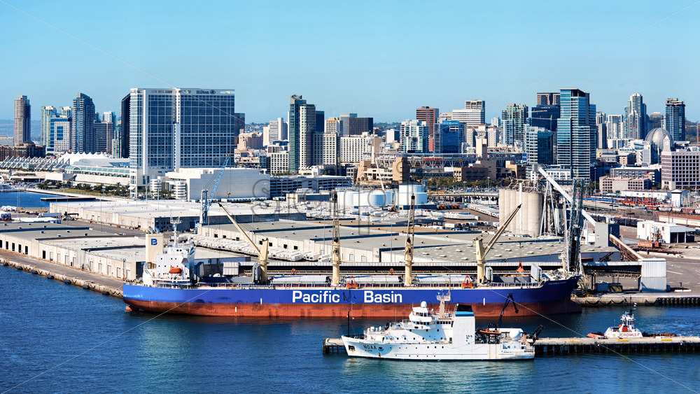 SAN DIEGO, CALIFORNIA – SEPTEMBER 30, 2019: Pacific Basin boat parked in city downtown dock. Skyline on background