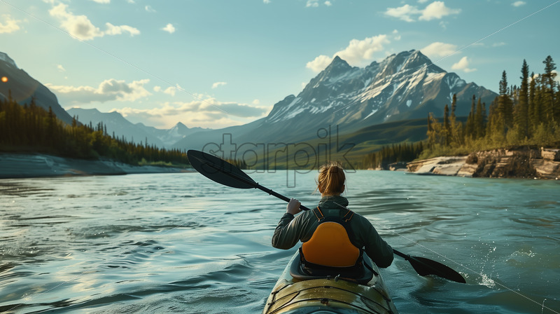 An explorer paddles through serene waters, surrounded by breathtaking scenery and wildlife. Their face is lit up with excitement and wonder as they navigate the twists and turns of a winding river or tranquil lake.