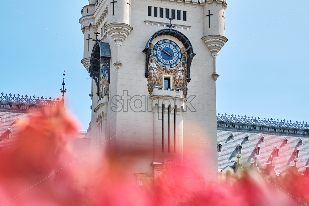 Home » Shop » buildings » Palace of Culture at daylight. Flowers on foreground. Close-up shot. Iasi, Romania