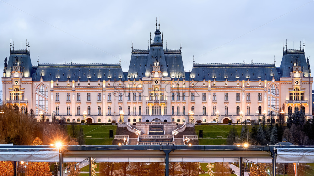 IASI, ROMANIA – NOVEMBER 6, 2021: Aerial drone panoramic view of the Palace of Culture in downtown at night. A lot of illumination, square in front of it