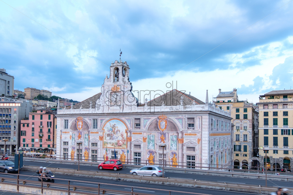 Palace of St. George at sunset. Cars riding on highway. Cloudy sky on background. Genoa, Italy Royalty Free Stock photo