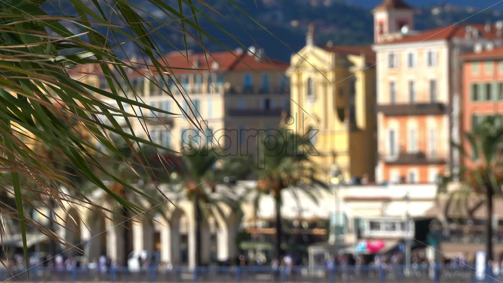 Palm leaves in front of a panoramic view of Nice’s beach, palm-lined promenade, and pastel colored buildings with the hills in the background Royalty Free Stock Video Footage