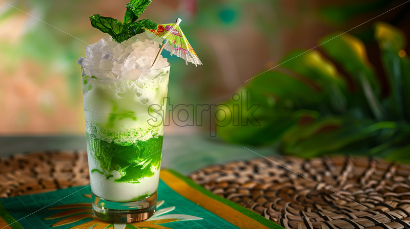 Es Cendol, a tall glass filled with layers of green pandan-flavored cendol jelly, coconut milk, palm sugar syrup, and shaved ice.