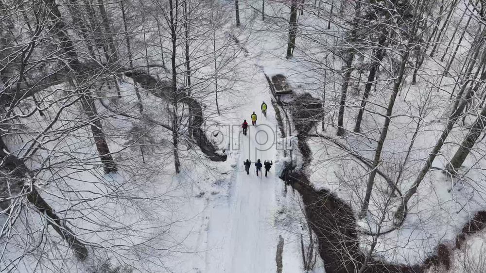 Panoramic aerial drone view of hikers walking in winter season with fir trees full of snow. Transylvania, Mount Ciucas in Romania, Carpathian mountains