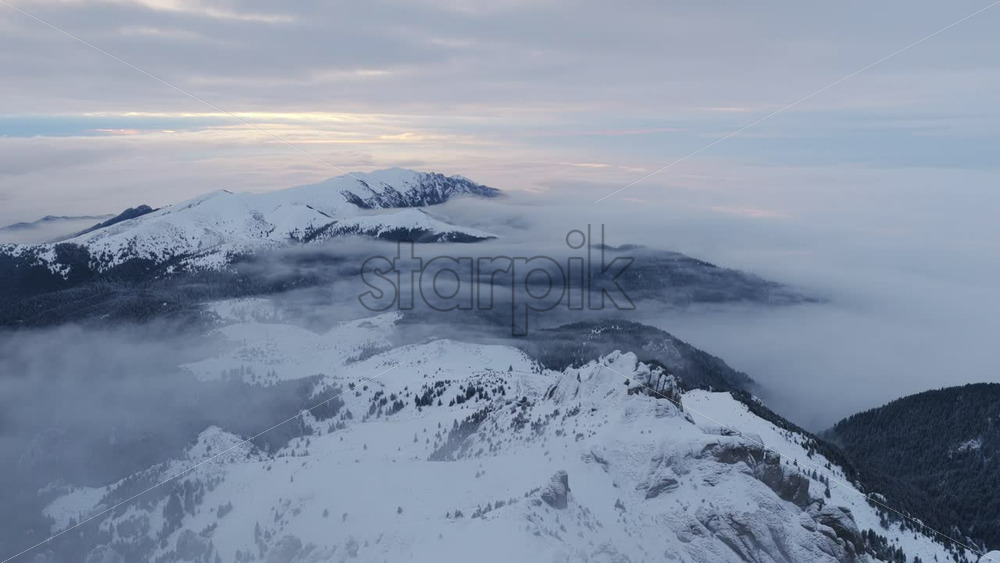 Panoramic aerial drone view of winter landscape in the mountains. Transylvania, Mount Ciucas in Romania