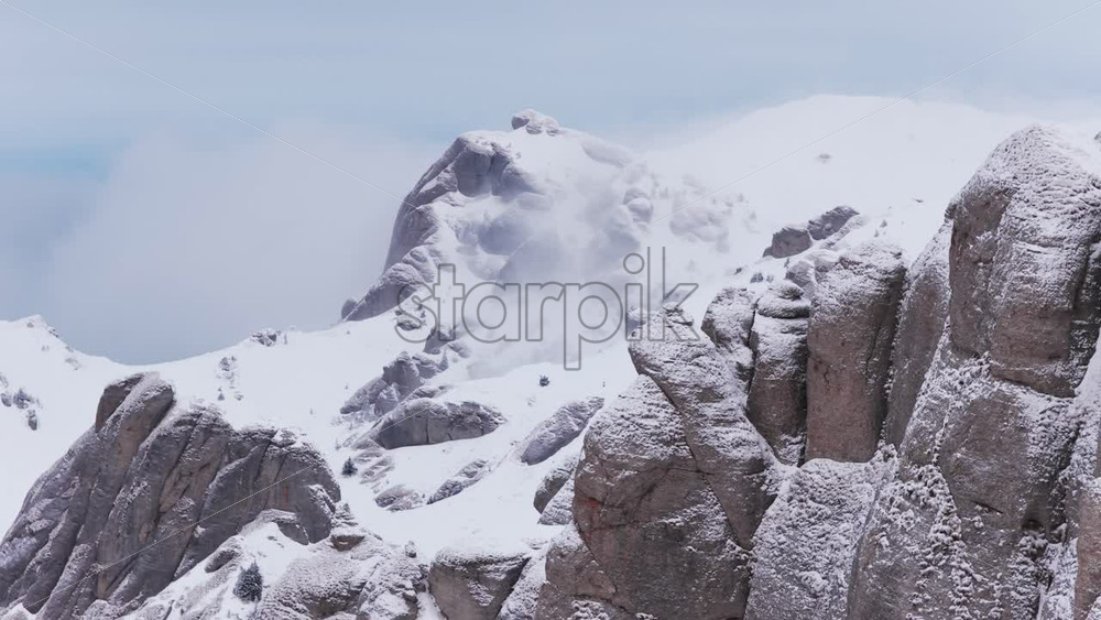 Panoramic aerial drone view of winter season with fir trees full of snow. Transylvania, Mount Ciucas in Romania, Carpathian mountains
