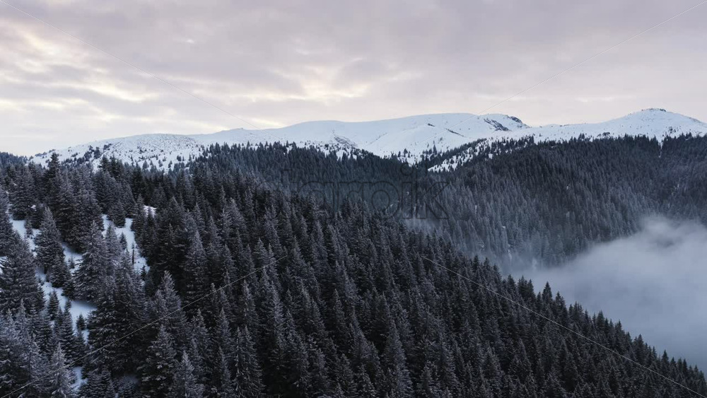 Panoramic aerial drone view of winter season with fir trees full of snow. Transylvania, Mount Ciucas in Romania
