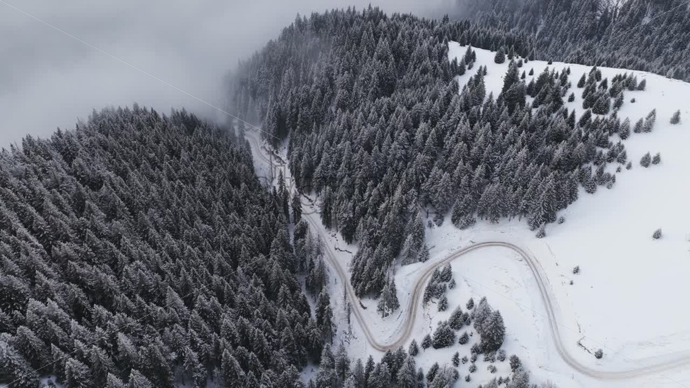 Panoramic aerial drone view of winter season with fir trees full of snow. Transylvania, Mount Ciucas in Romania