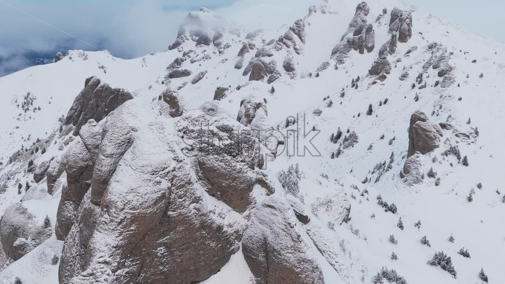 Panoramic aerial drone view of winter season with fir trees full of snow. Transylvania, Mount Ciucas in Romania