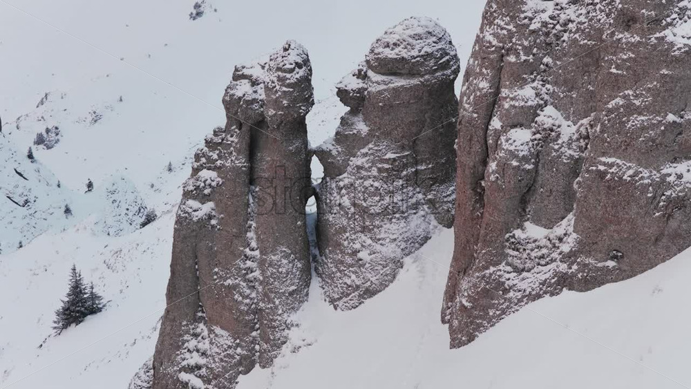 Panoramic aerial drone view of winter season with fir trees full of snow. Transylvania, Mount Ciucas in Romania