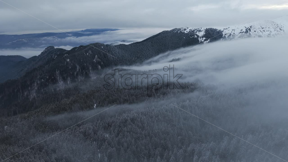 Panoramic aerial drone view of winter season with fir trees full of snow. Transylvania, Mount Ciucas in Romania
