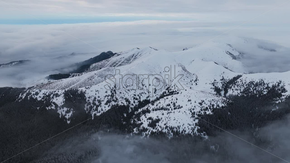 Panoramic aerial drone view of winter season with fir trees full of snow. Transylvania, Mount Ciucas in Romania