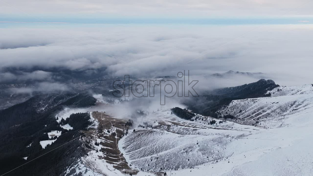 Panoramic aerial drone view of winter season with fir trees full of snow. Transylvania, Mount Ciucas in Romania