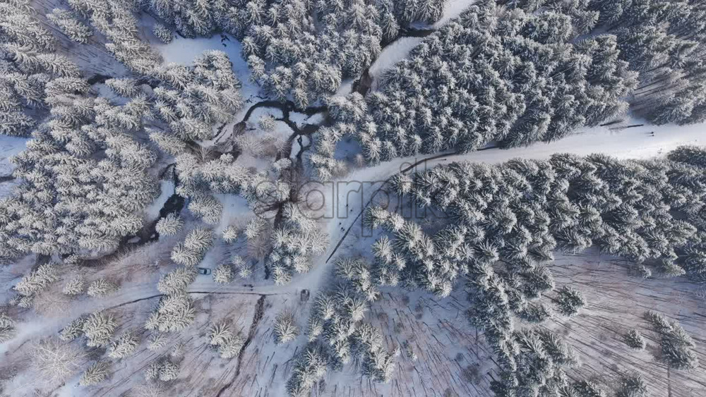 Panoramic aerial drone view of winter season with fir trees full of snow. Transylvania, Mount Ciucas in Romania