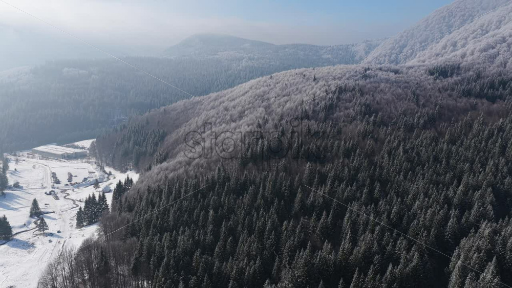Panoramic aerial drone view of winter season with fir trees full of snow. Transylvania, Mount Ciucas in Romania