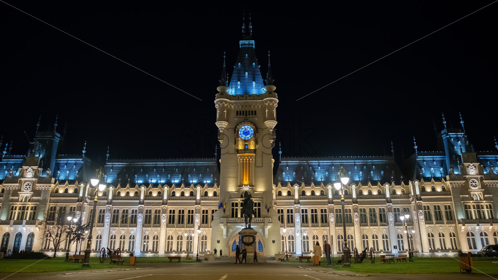 Panoramic view of the Palace of Culture in Iasi downtown at night, Romania. A lot of illumination, square in front of it