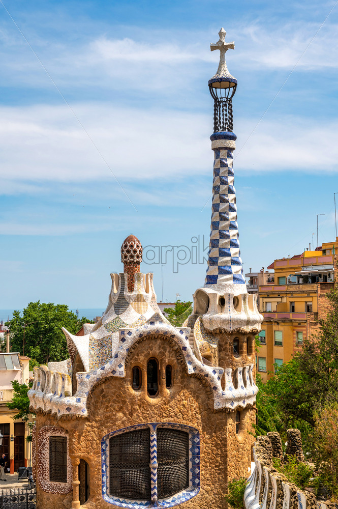 Park Guel, buildings with unusual architectural style, Barcelona on the background, Spain