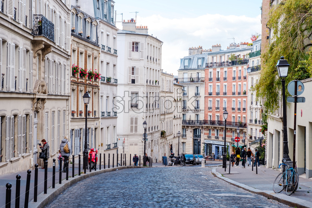 PARIS, FRANCE – OCTOBER 01, 2018: Shot from the center of a street in Paris to a road. Local people on the streets having a break from work. Shot at afternoon Royalty Free Stock photo