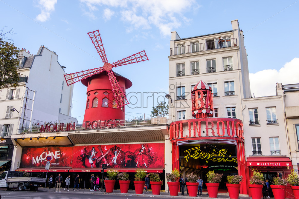 PARIS, FRANCE – OCTOBER 01, 2018: Wide view to the famous Moulin Rouge cabaret in Paris. A well known entertainment place in France Royalty Free Stock photo