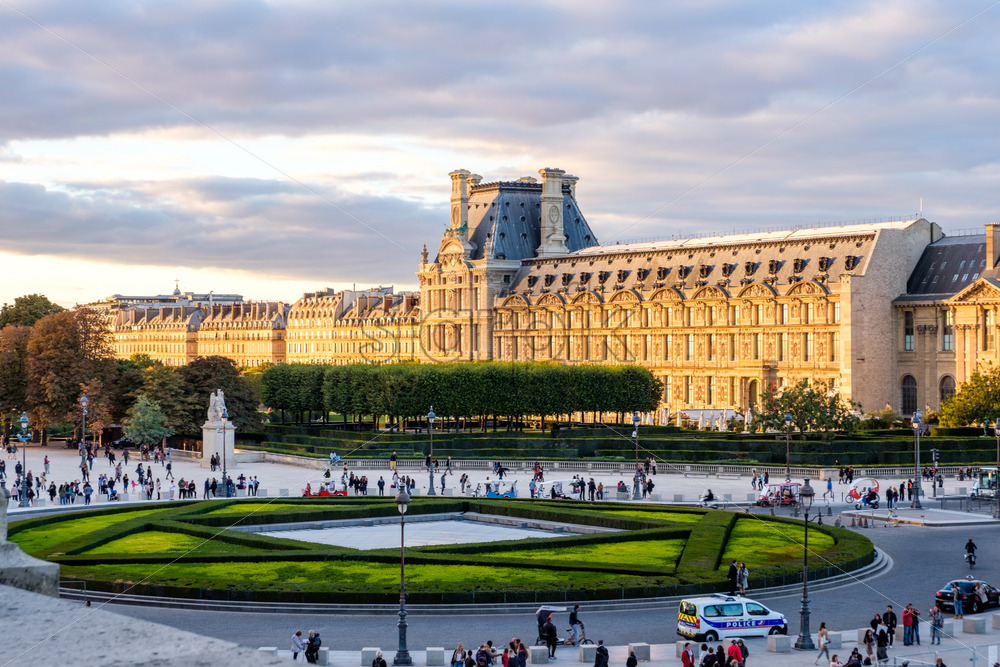 Home » Shop » photo » PARIS, FRANCE – OCTOBER 03, 2018: Close up shot to Louvre a part of Louvre from the side. Lots of tourists on the road. Bright and warm sunlight hitting the bulding