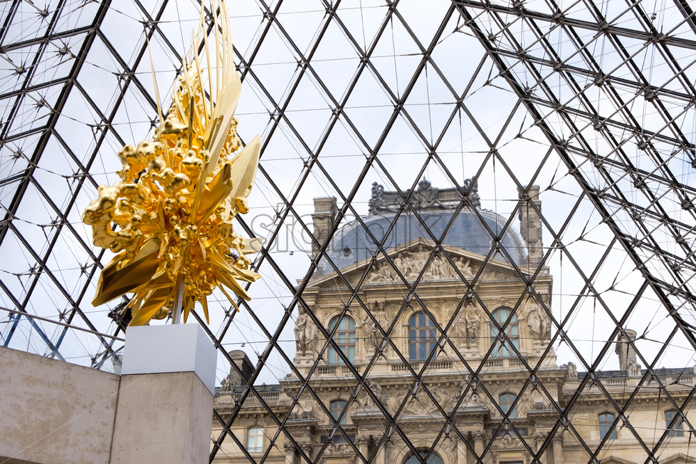 PARIS, FRANCE – OCTOBER 03, 2018: Kohei Nawa artwork at the entrance of Louvre pyramid. Golden throne shot horizontaly. Blue sky in the background. 3D looking object mesh