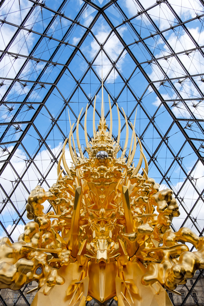 PARIS, FRANCE – OCTOBER 03, 2018: Kohei Nawa artwork at the entrance of Louvre pyramid. Golden throne shot verticaly respecting symmetry Royalty Free Stock photo