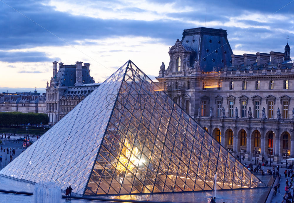 PARIS, FRANCE – OCTOBER 03, 2018: Louvre Museum at sunset. People on promenade. Yellow sunshine reflecting on building Royalty Free Stock photo