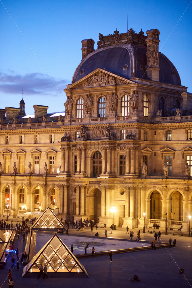 Louvre Museum facade at sunset. Pyramid on foreground. Paris, France