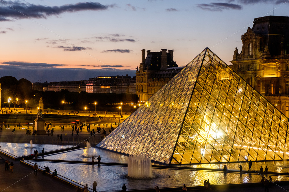 PARIS, FRANCE – SEPTEMBER 28, 2018: Louvre museum during at sunset. Reflections on the blue and transparent pyramid Royalty Free Stock photo