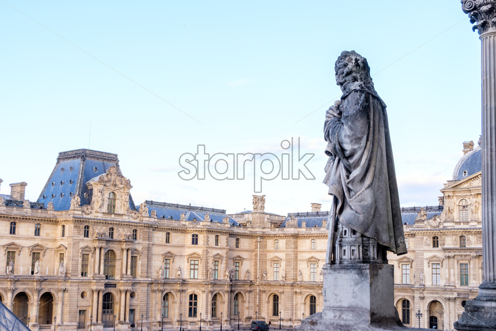 PARIS, FRANCE – OCTOBER 03, 2018: Statue representing an old man in the Louvre museum’s teritory. Magenta accents on the building. Clear sky at sunset Royalty Free Stock photo