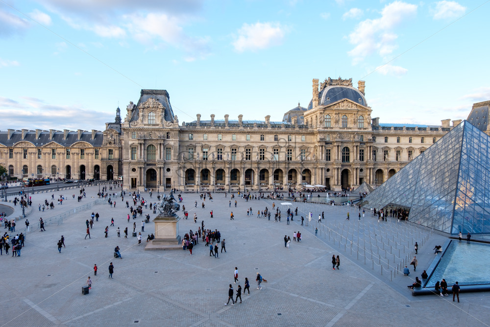 PARIS, FRANCE – OCTOBER 03, 2018: Wide angle aerial view to Louvre museum. Blue sky with some clouds. Shot at sunset. Tourists leaving on of the most important hystorical place in Paris Royalty Free Stock photo