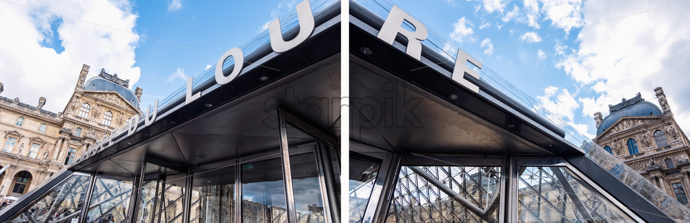 PARIS FRANCE – OCTOBER 3, 2018: Collage of Louvre Museum piramid entrance. Sunny day with some clouds.