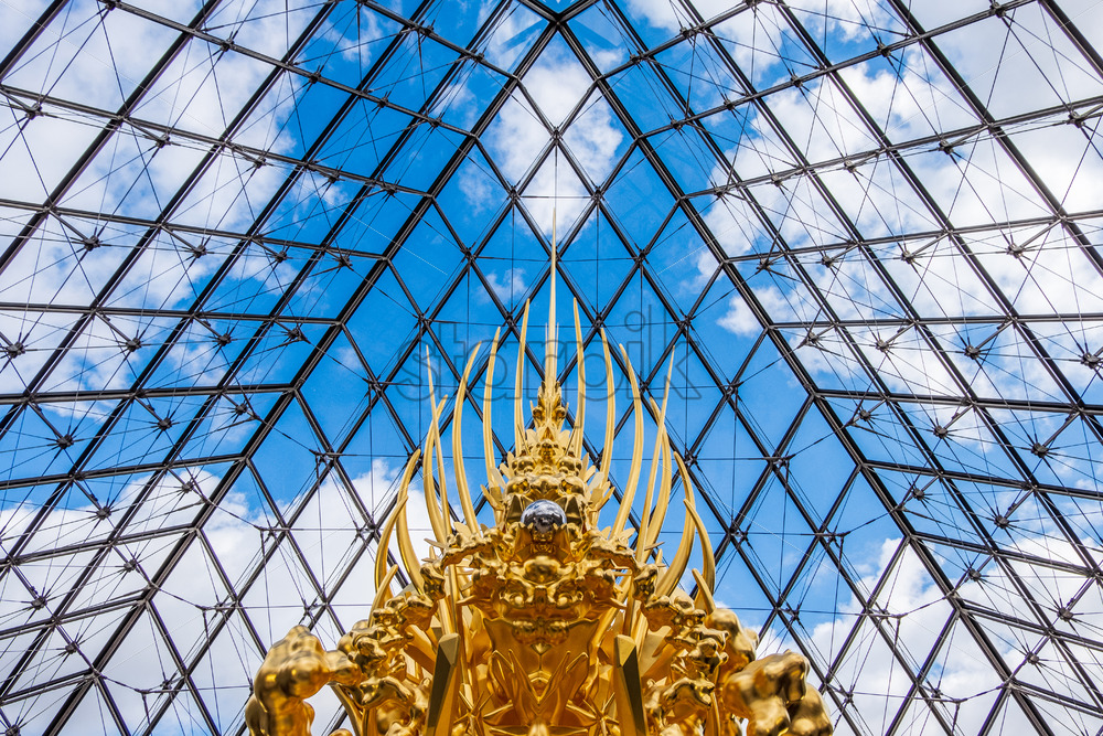 Home » Shop » photo » PARIS FRANCE – OCTOBER 3, 2018: Kohei Nawa artwork at the entrance of Louvre pyramid. Golden throne shot verticaly. Grey sky in the background. 3D looking object mesh