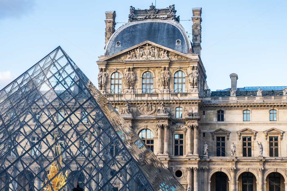 PARIS FRANCE – OCTOBER 3, 2018: The Museum of Louvre during the sunset of the day. The building is reflecting on the surface of a pyramid. Close up shot