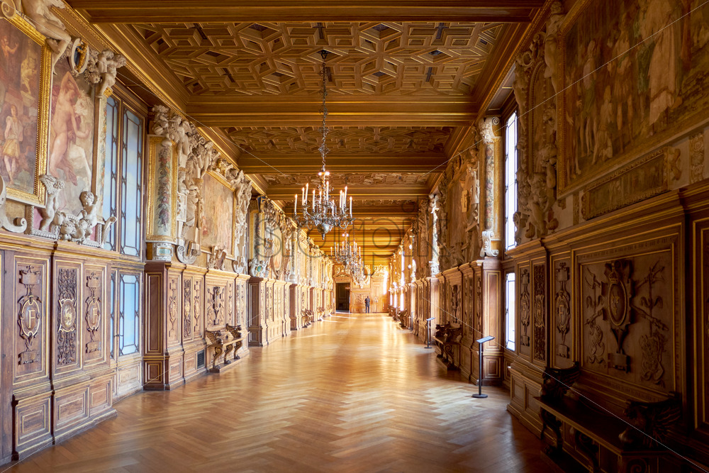 PARIS, FRANCE – SEPTEMBER 09, 2018: Gallery of Francis I in orange and teal colors. The Palace of Fontainebleau Royalty Free Stock photo