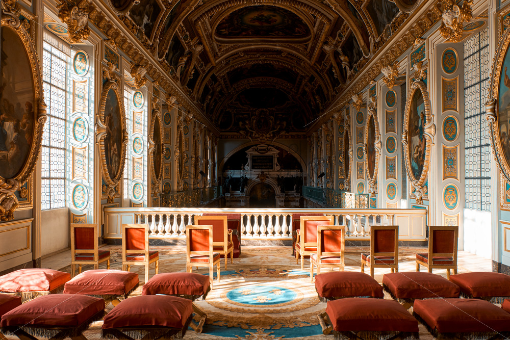 PARIS, FRANCE – SEPTEMBER 09, 2018: Royal chapel throne room in orange and teal colors. The Palace of Fontainebleau Royalty Free Stock photo