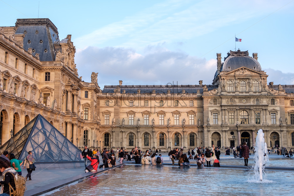 PARIS, FRANCE – SEPTEMBER 28, 2018: Louvre museum during at sunset. Reflections on the blue and transparent pyramid Royalty Free Stock photo