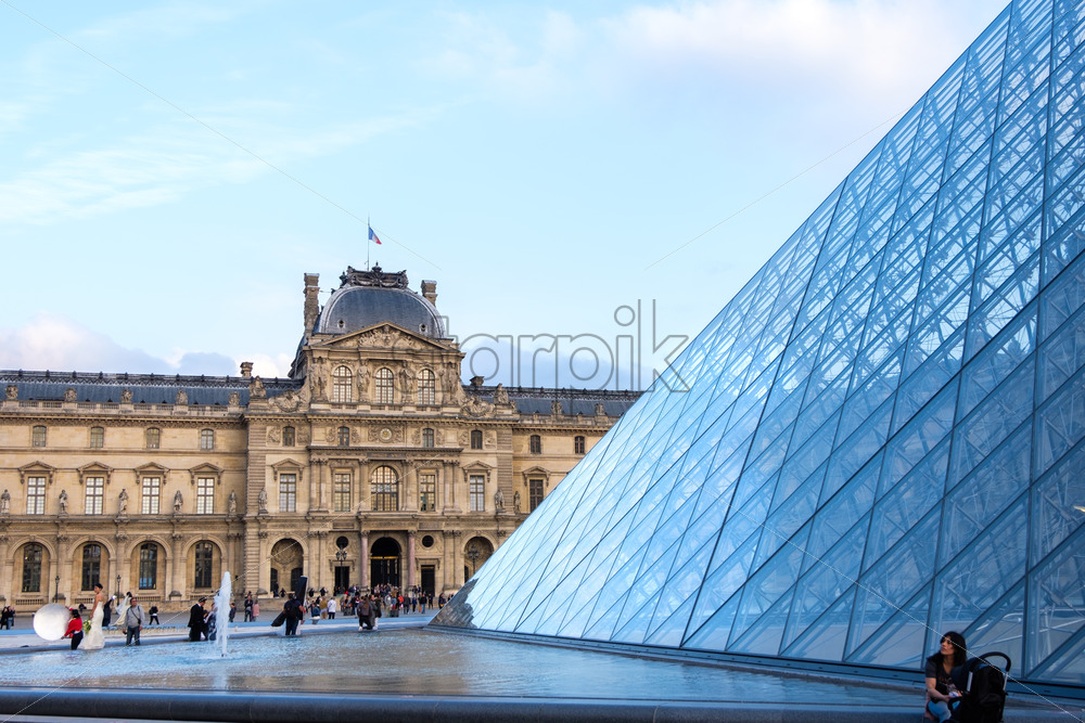 The Museum of Louvre during a cloudy day. The building is reflecting on the surface of a pyramid. Close up shot. Paris, France Royalty Free Stock photo