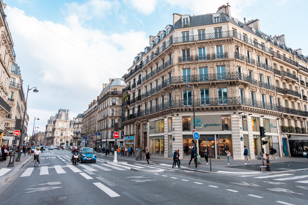 PARIS, FRANCE – SEPTEMBER 28, 2018: Orange and teal look to a street in Paris. People crossing the road and few cars in the trafic. Wide angle view