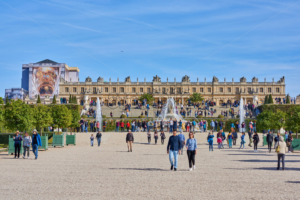 PARIS, FRANCE – SEPTEMBER 28, 2018: Palace of Versailles main facade at daylight. People walking in front Royalty Free Stock photo